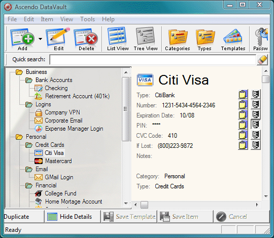 Ascendo DataVault armazena informações confidenciais como números de cartões de crédito, nomes de usuários,
